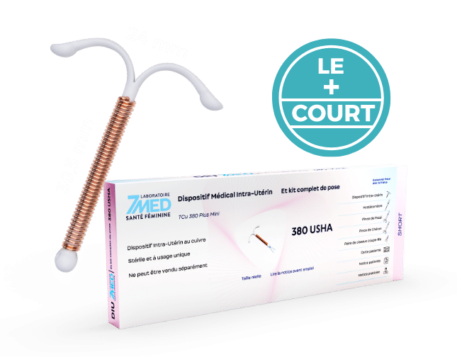 7MED 380 USHA est un dispositif intra-utérin prêt à l’emploi, sous sachet stérile. Il est composé d’un corps en forme de Y en polyéthylène basse densité avec du sulfate de baryum, opaque aux rayons X. Il comporte deux bras flexibles et une tige verticale autour de laquelle est enroulé un fil de cuivre de 0,40 mm de diamètre offrant une surface de 380 mm². Le corps présente un fil mono filament en polyamide pour un retrait facile. Il possède un inserteur rigide. Son format « short » permet de s’adapter au mieux à l’anatomie de la patiente, notamment à celle d’une femme nullipare. Ce modèle est conçu pour les cavités utérines dont la hauteur est inférieure à 7 cm.